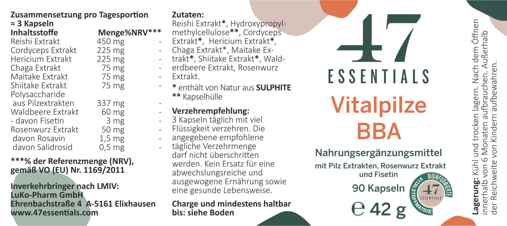 Reishi Extrakt*, Kapselhülle: Hydroxypropylmethylcellulose, Cordyceps Extrakt*, Hericium Extrakt*, Chaga Extrakt*, Maitake Ex-trakt*, Shiitake Extrakt*, Walderdbeere Extrakt, Rosenwurz Extrakt. *Enthält von Natur aus Sulphide